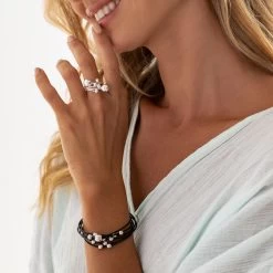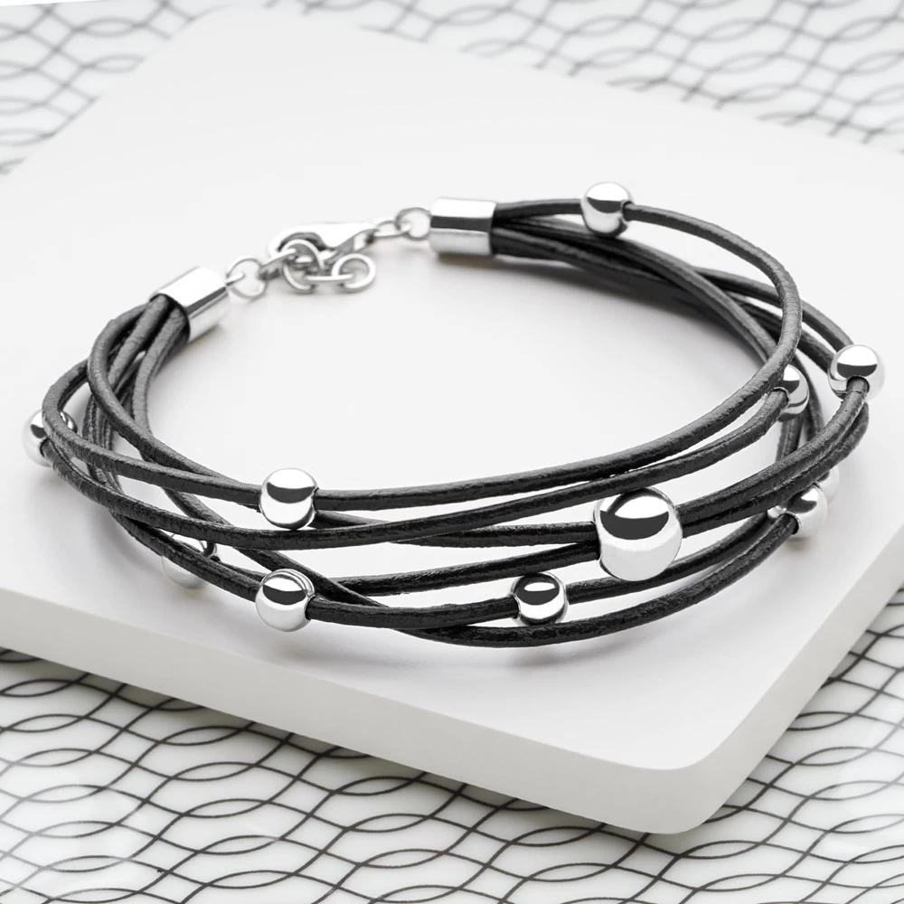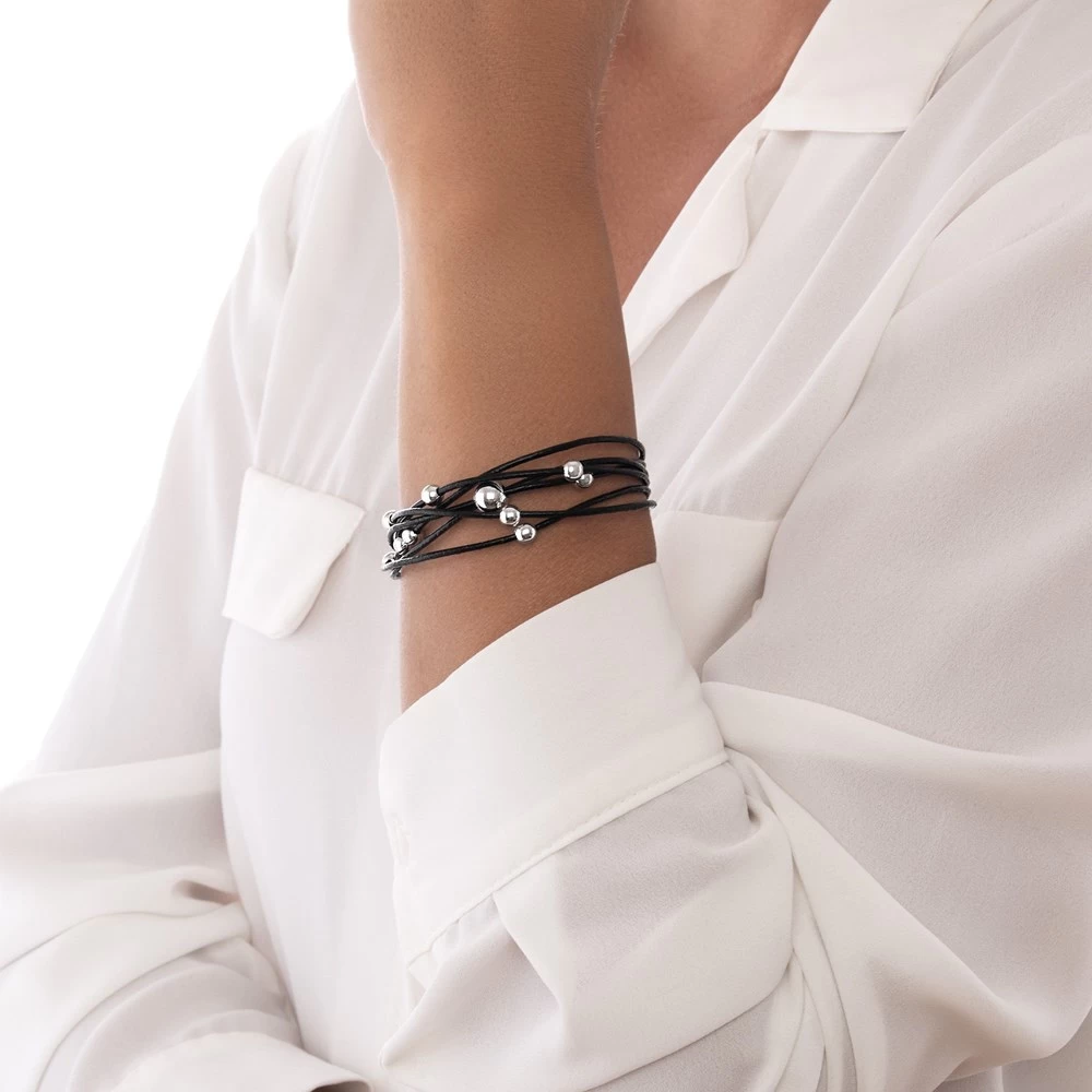 Six loosely woven black cords thread through a host of moveable silver beads for the ultimate contrast. The perfect piece to sit pretty with a black camisole or white angora shrug. Length: 19-21cm (adjustable).
