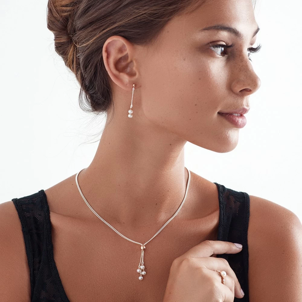 Beautiful elongated earrings made from delicate 1.5mm ball chain and finished with a polished rose gold plated orb and tassels of rose gold framed freshwater pearls. Designed to drape elegantly from the lobe. Size: 32x9mm.