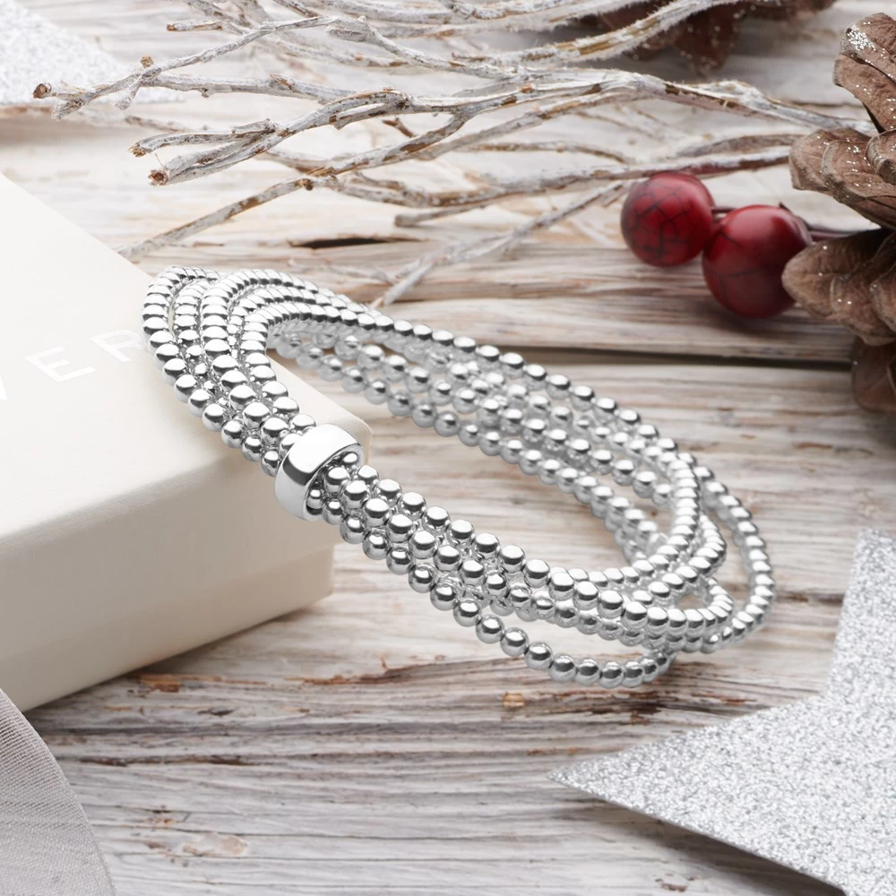 Fall in love with this distinctive stack bracelet you will wear forever. A single stream of beads wound five times and held together with a silver loop and a single cube bead.