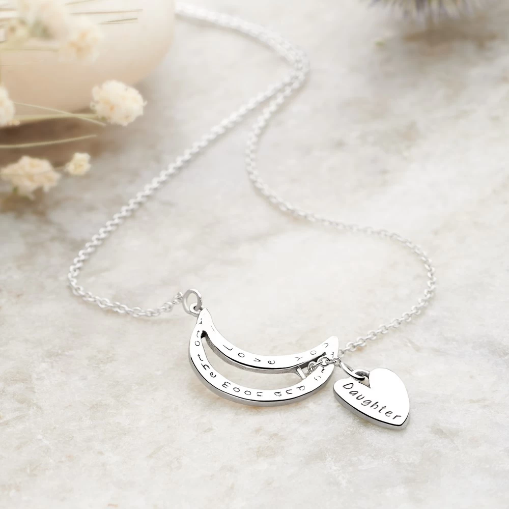 This beautiful lariat style chain represents your endless love for your Daughter. The moon is engraved with ‘Love you to the moon and back’ and the elongated heart is engraved with ‘Daughter’. Moon size: 16-9mm.