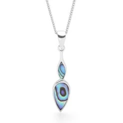 Gentle drops of abalone stacked upon each other inside a delicate case of silver. A piece designed to move freely to display the natural beauty of the shimmering abalone. Size: 35x7mm (inc loop). Includes 40cm curb chain. Longer chains available.