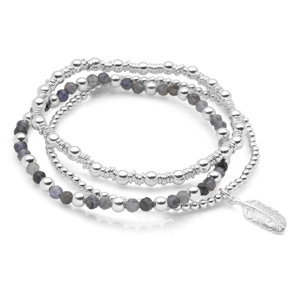 Feathers appear when an angel is near. Often called the calling card of the angels, this feather symbolises communication in this set of three bracelets. Our much-loved feather talisman sits beautifully next to shining beaded bracelets and violet Iolite stones. Enhance your jewellery collection with the different shapes and textures with this set.