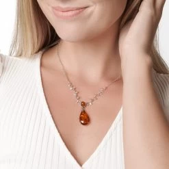 A glowing droplet of cognac amber is framed by silver leaf detailing to bring out the enchanting nature of this beautiful honey-coloured stone. So eye catching and easy to wear. Width: 34x13mm. Length: 41-45cm.