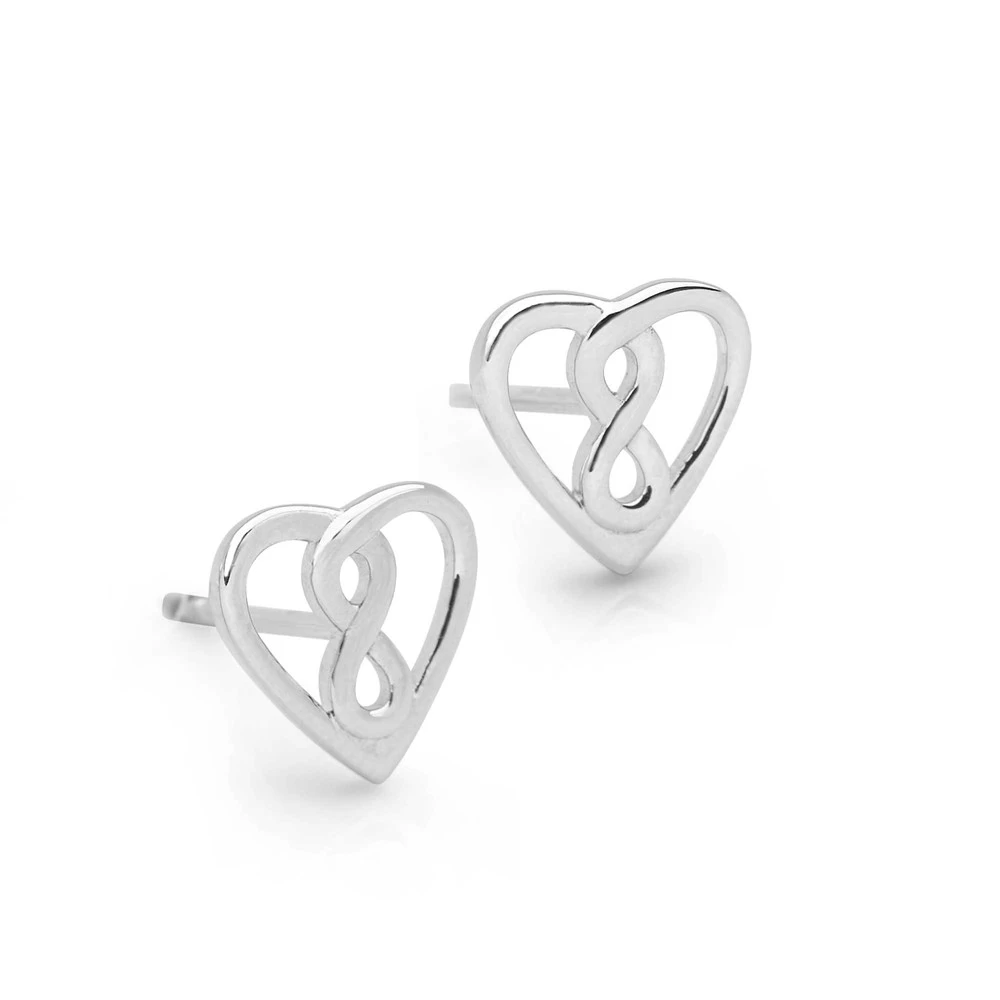 Fall in love with these perfect heart studs as they merge and twist to create the prettiest silver display. Rhodium plated for a strong finish.ย