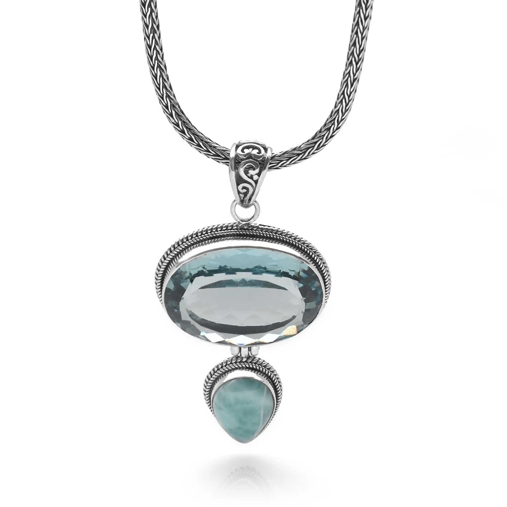 A glittering blue topaz and shimmering cabochon of larimar give oceanic allure to this piece, the perfect shades to tie together any look. With handmade chain to complete the ethnic vibe. Size: 52x26mm (inc loop). Includes: 40cm handmade chain. Longer chains available.