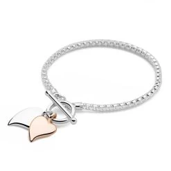 A smooth silver heart is highly polished to reflect the dazzling beauty of a curvaceous rose gold-plated heart. Finished with a classic T-bar, these feminine heart charms sit on a chunky chain for a romantic silhouette. Bracelet length: 18.5cm (inc T-bar).