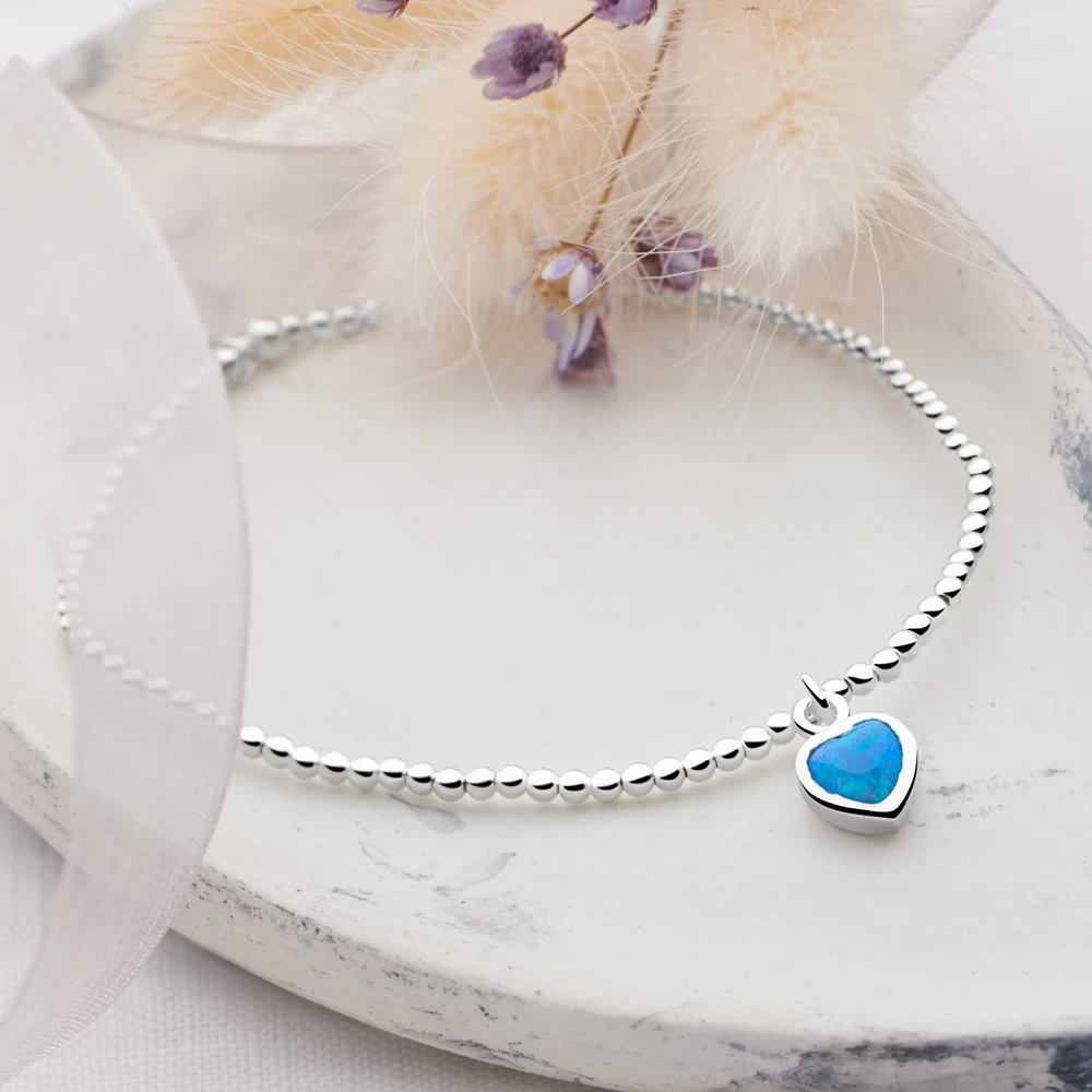 Bijou silver beads threaded on an expandable silver bracelet with a faux blue opal heart charm exquisitely embraces minimalist jewellery. A perfect piece to wear alone or stack woth other bracelets in your collection.