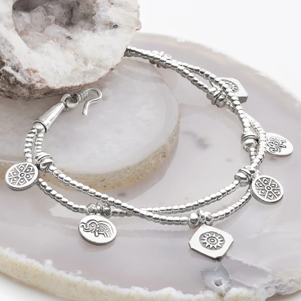 A charming piece from the hill dwelling silversmiths of Thailand. See and feel its raw beauty in every handmade detail with its delicately embossed silver beads as it fastens prettily with a traditional fishhook clasp. Width: 16mm. Length: 19cm.