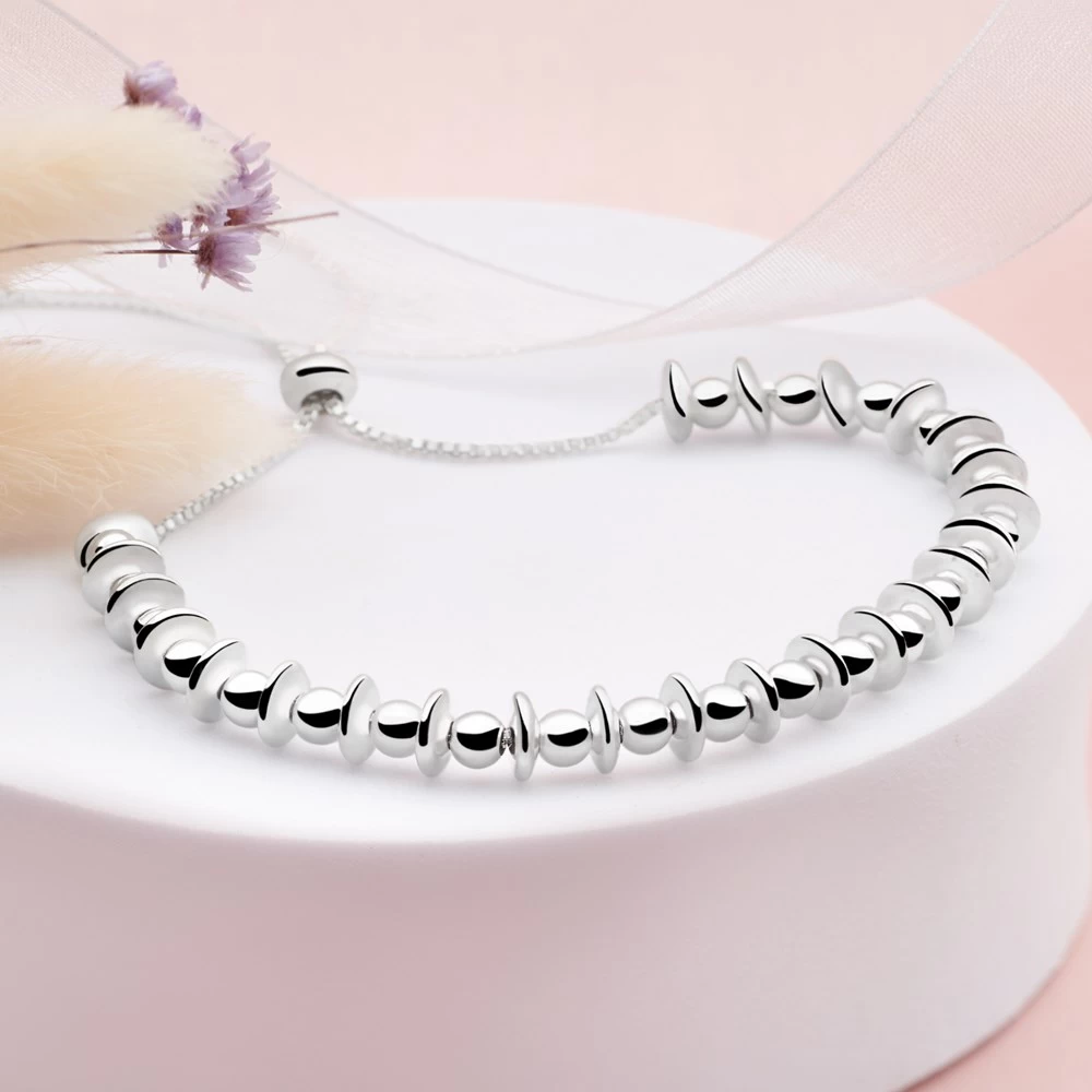 This heavyweight bracelet is made from a series of gleaming silver beads and discs, threaded together on a box chain with an adjustable toggle clasp.
