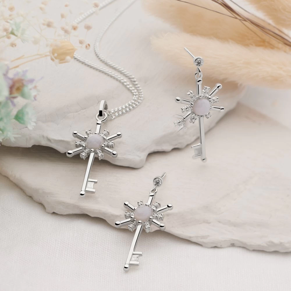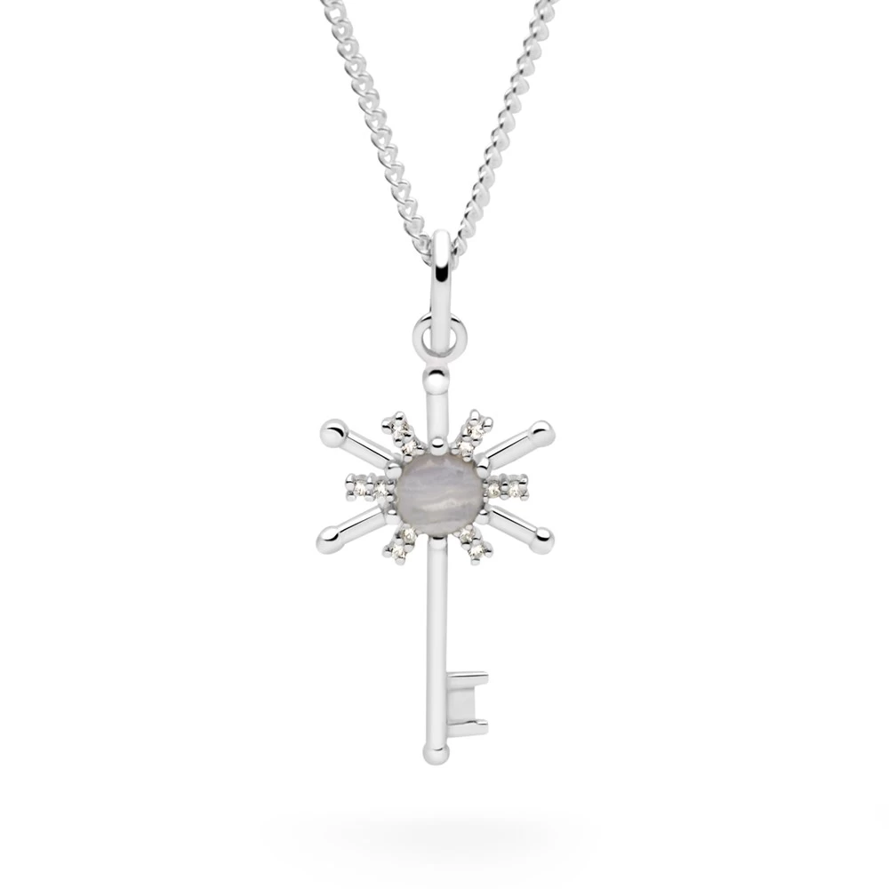 A simple silver key brought to life with sparkling cubic zirconia and blue lace agate.