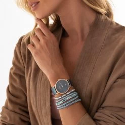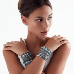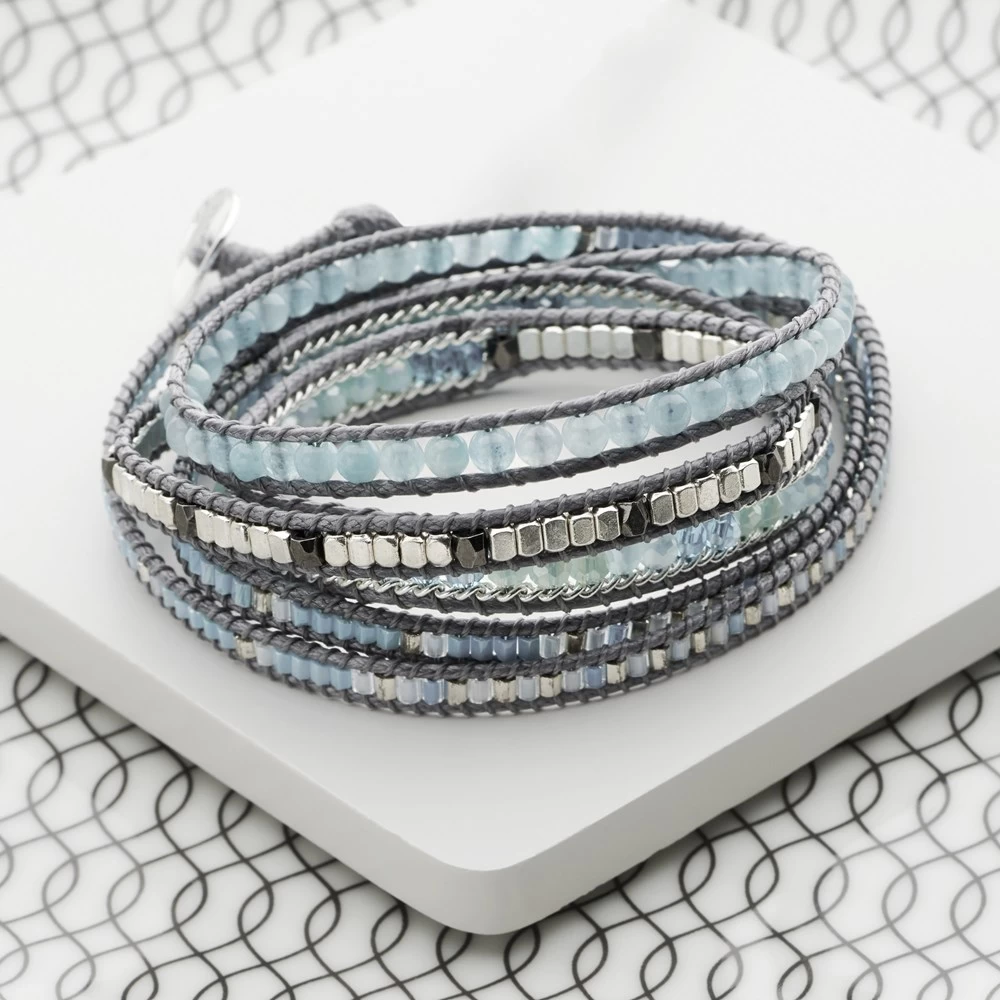 This unique style bracelet gives the impression of wearing multiple bracelets in one. Unravelling to reveal exquisite beadwork, wrap this bracelet around your wrist – crisscrossed or straight. Fasten with a shining silver disc and loop.