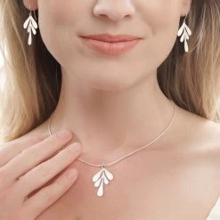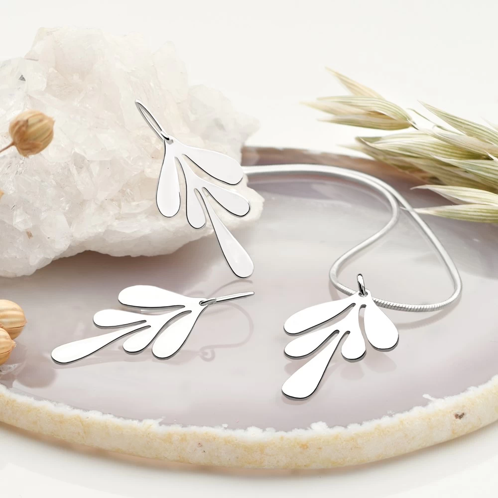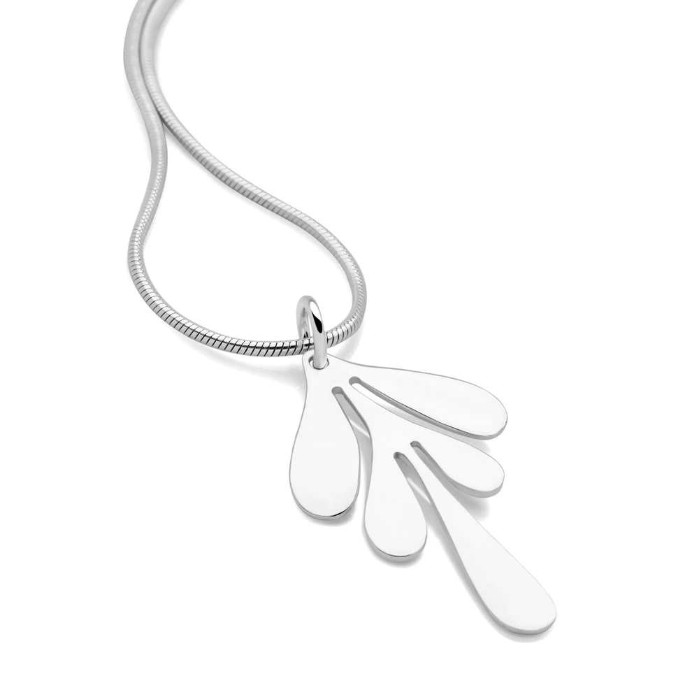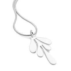 Playful drops of abstract silver melt down into wide surfaces, reflecting light with their mirror shine finish.