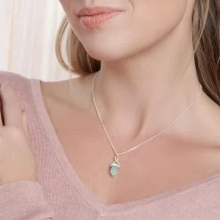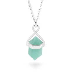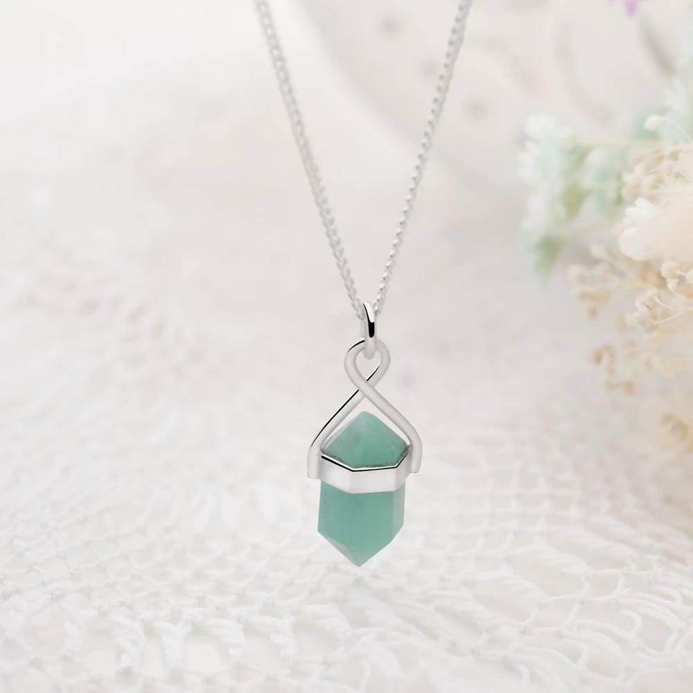 A small wand of amazonite is shaped and pointed to display all of its natural beauty encased inside a silver frame.