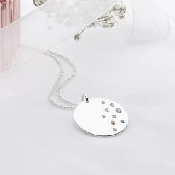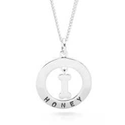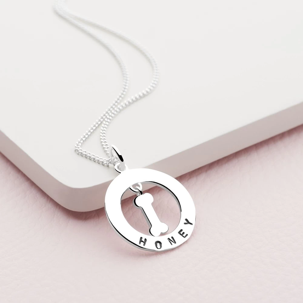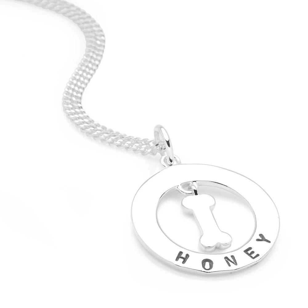A beautiful pendant which can be personalised with your name, or your pets. This classic piece makes a wonderful quirky gift. We can only stamp in the font shown with the Roman alphabet and all numbers. The text is hand stamped letter by letter. This creates a quirky uneven finish rather than a perfect machine straight finish. We do this as we feel it adds to the individual charm of each piece. No two pieces will be alike!