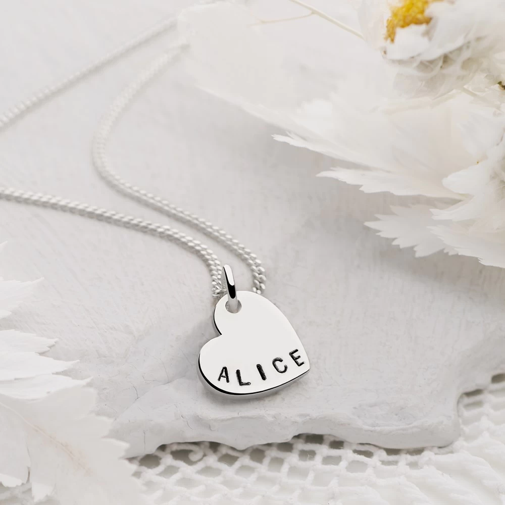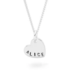 A highly polished plain silver heart which can be personalised with a name (up to 5 characters long) of your choice.