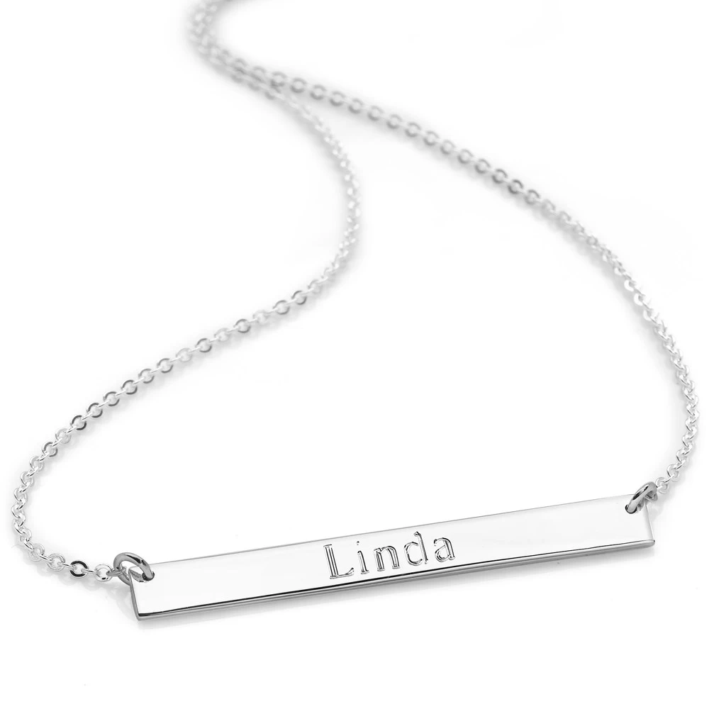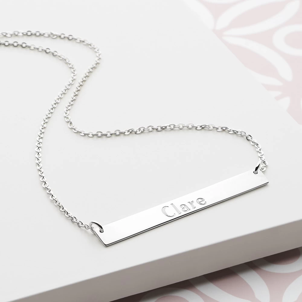This horizontal bar chain is perfect for personalising if required. Wear alone or layer with other necklaces in your collection. Please allow up to an extra 3 days delivery on orders that include personalised items. Length 45cm (inc clasp).