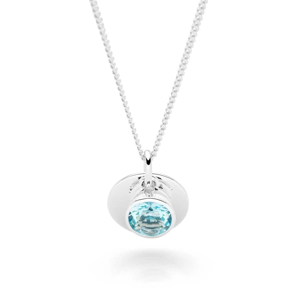 This sterling disc pendant in high shine silver with an shining blue cubic zirconia stone makes a wonderful gift for those closest to your heart. We can only engrave in the font shown (in capital letters) with all numbers. No two pieces will be alike. Pendant size: 18x15mm (inc loop). Includes 40cm curb chain. Longer chains available.