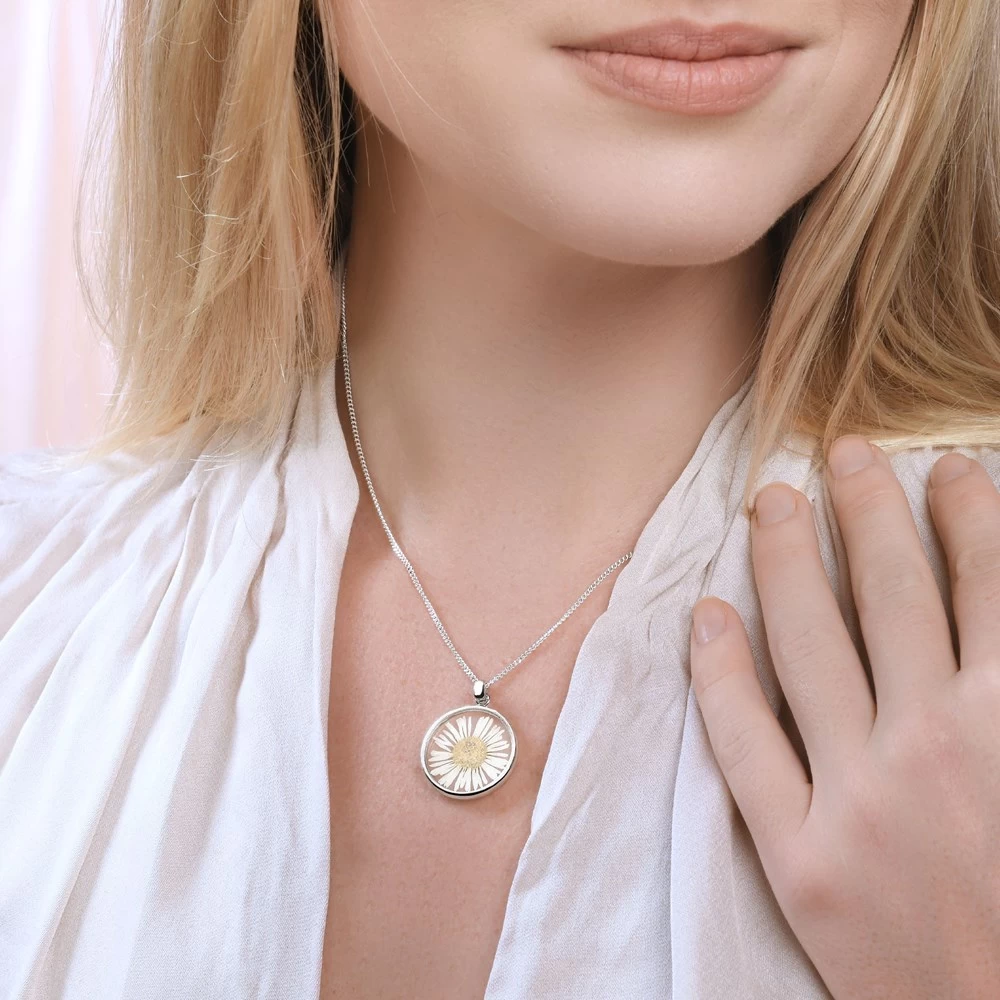 A pressed daisy sits inside a round case, framed in silver forever displaying its natural beauty.