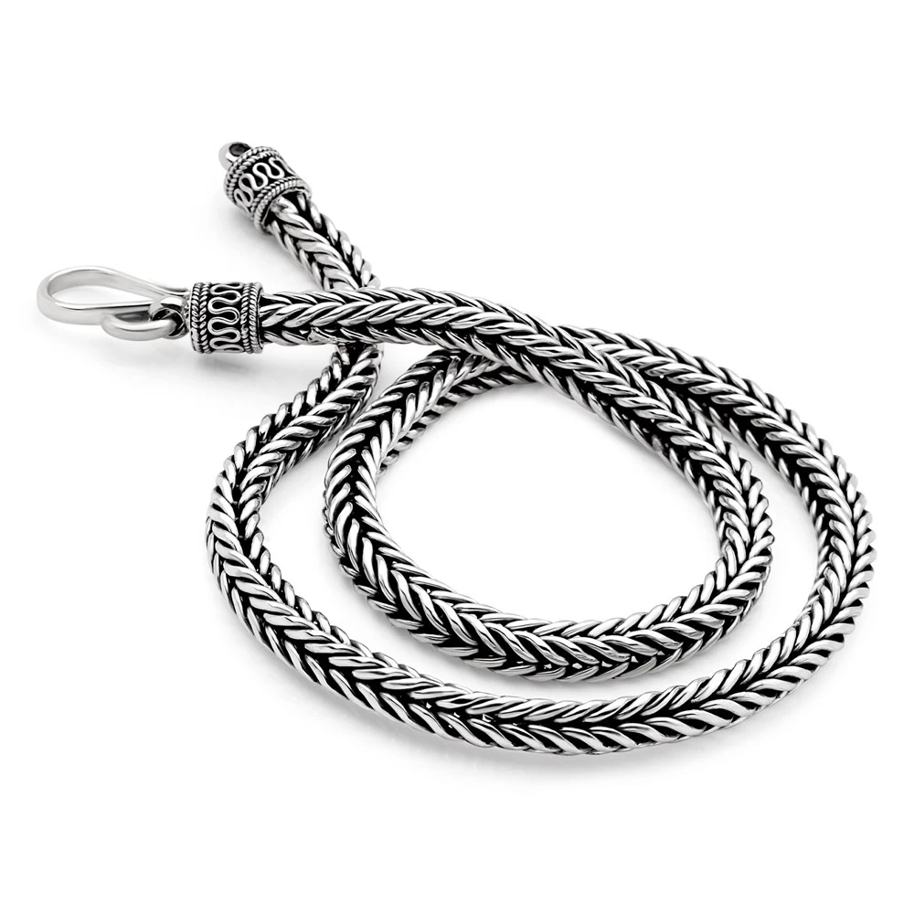 This stunning, flat edged chain known as the Tulang Naga Kotak weave is a favoured style in the orient. We don’t know what you’ll like most about this…its sinuous snaky movement…or its smooth-but-chunky feel. Width: 5mm.