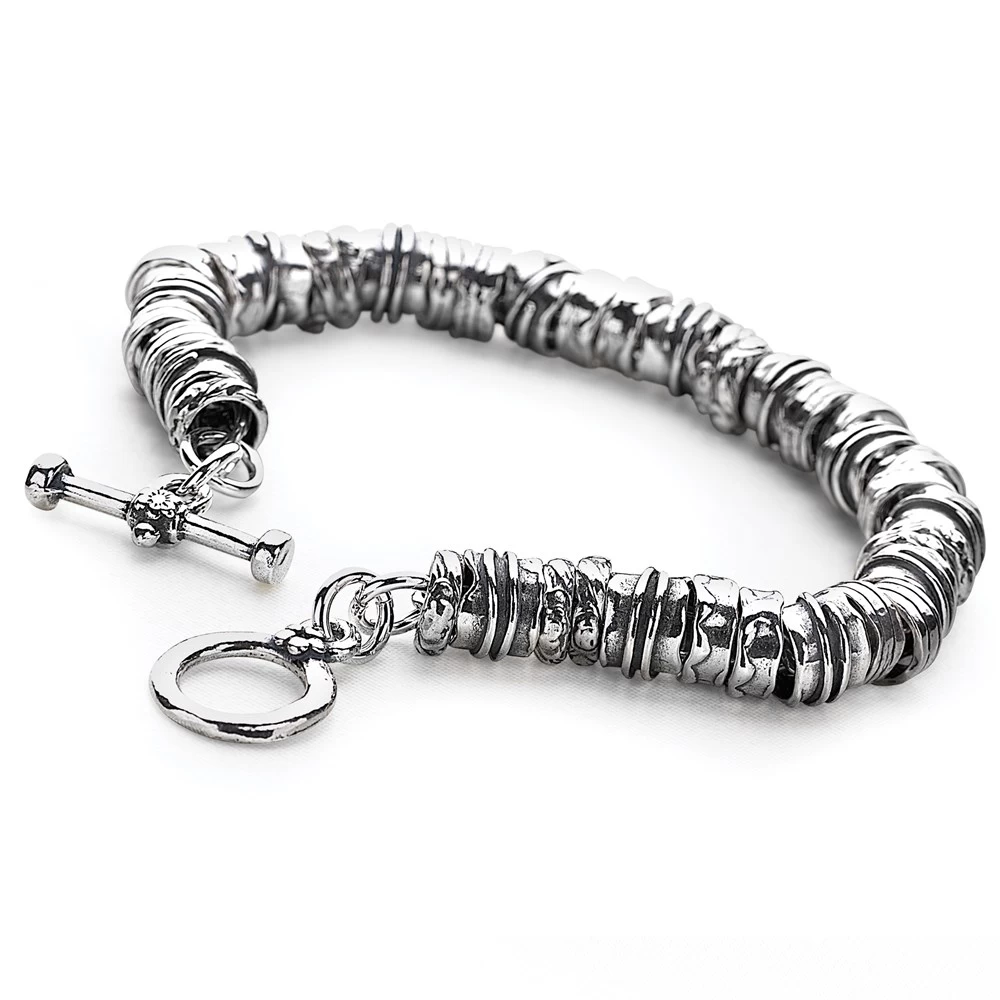 An exquisite gathering of stunning silver halos, each with its own handcrafted charm. As delightful to touch as to wear. Team with a stack of silver rings. Width: 8mm. Length: 19cm (inc T-bar).