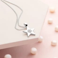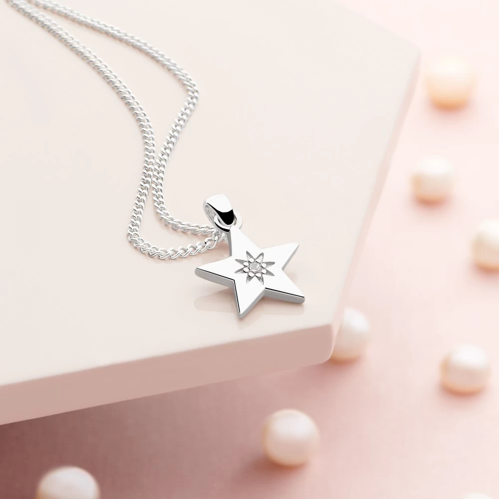 This silver star is adorned with a shining cubic zirconia stud and cut-out grooves which give the impression of glowing beams from its centre. Size: 19x12mm (inc loop). Includes 40cm curb chain. Longer chains available.