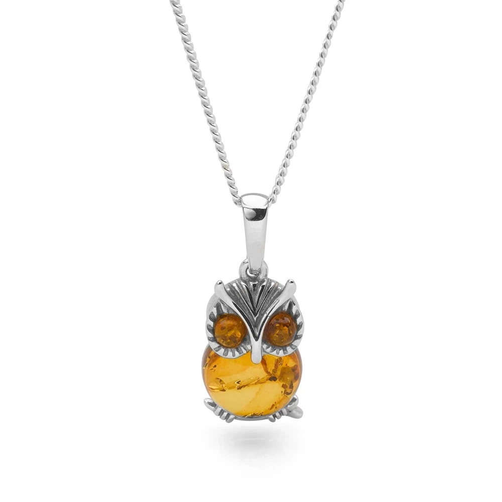 We love this adorable little owl pendant crafted in sterling silver, with a cognac coloured amber. Width: 25x10mm. Includes 40cm curb chain. Longer chains available.