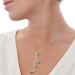 Design talent always catches the eye, and this organic squiggle of exotic droplets, set with abalone shell, is a real head turner. Add a plunging halter neck top in contrasting violet for a dramatic leap across the colour wheel. Size: 62x14mm. Includes: 40cm snake chain.