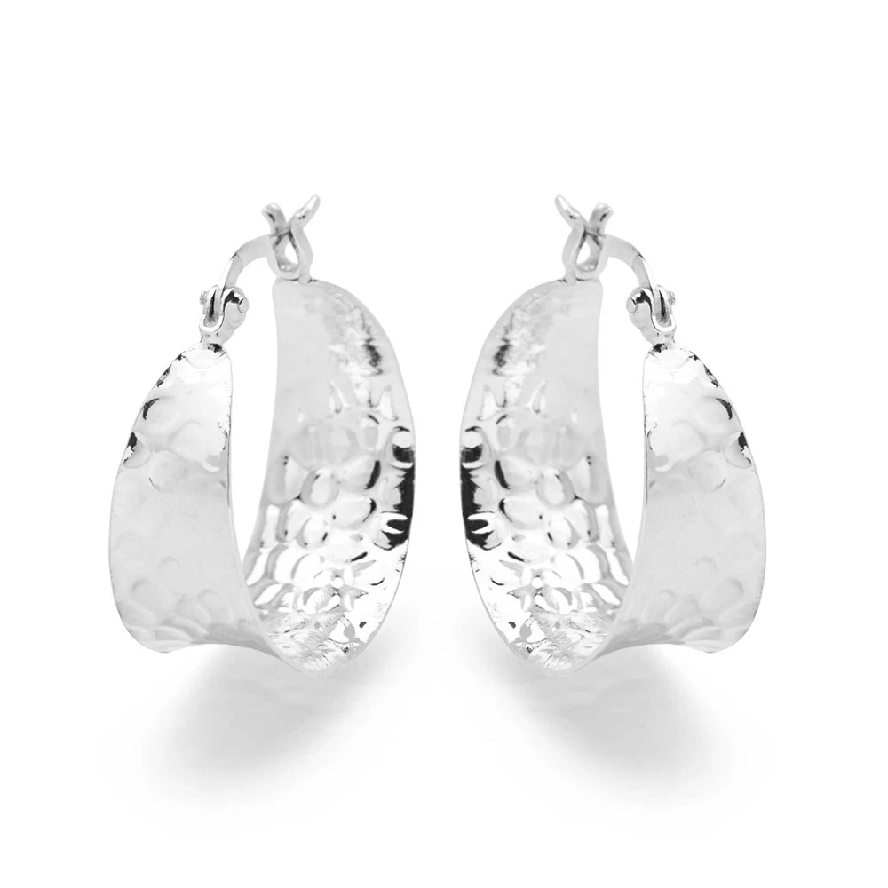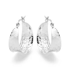 These stunning concave hoops feature an extra wide body and a beautifully hammered surface. These hoops really make a statement and will effortlessly take you from day to night in style.